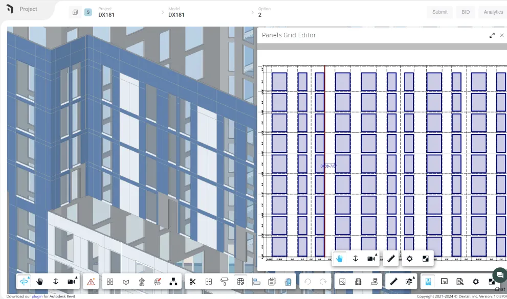 Using Revit models with Dextall Studio’s web app, provides designers with the ability to analyze Façade design analytics and Material metrics, such as: the Window/Wall Ratio, Total opaque areas, Total window areas, numbers of panel types. Within the Dashboard, designers will be able to see real-time metrics for individual panels, panel systems, or entire facades.